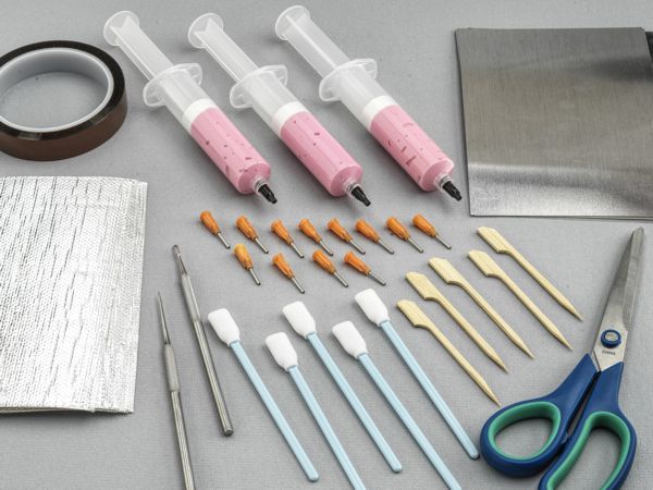 Ten zestaw zawiera wszystkie narzędzia i materiały potrzebne do ochrony wrażliwych na temperaturę obszarów zmontowanej płytki drukowanej przed nadmiernym nagrzaniem podczas prac naprawczych.